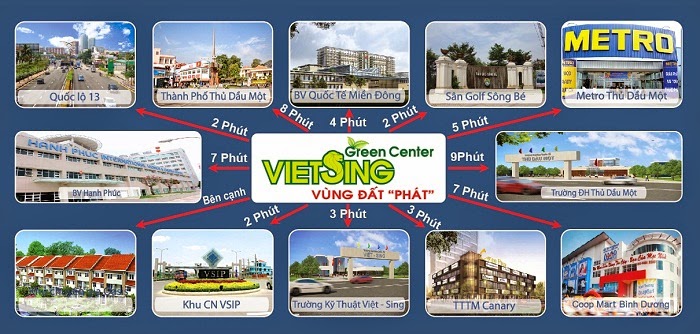 Tiện ích nội khu có đủ hết và đi lại các nơi khác ở Tp. Thuận An cực tiện lợi. Vị trí đắc địa trung tâm KDC Việt Sing thuận tiện sinh hoạt, công tác. Gần KCN Vsip 1, KCN Việt Hương, KCN Sóng Thần, ….Cách TP.HCM khoảng 10km. Gần siêu thị Aeon Mall, siêu thị Việt Sing, TTTM Big C, Coopmart, sân vận động Gò Đậu, ….Cách Quốc Lộ 13 khoảng 500m, đường 22/12 200m.