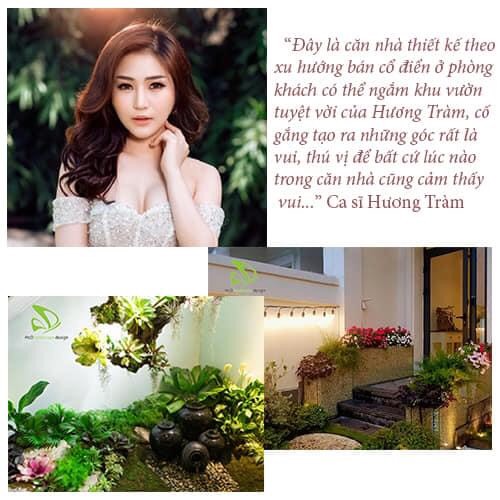 Ca sĩ Hương Tràm cho biết về căn nhà của mình: “Đây là căn nhà thiết kế theo xu hướng bán cổ điển, ở phòng khách có thể nhìn ngắm khu vườn tuyệt với của Hương Tràm, cố gắng tạo ra những góc rất là vui, thú vị để bất cứ lúc nào trong căn nhà cũng cảm thấy vui...”