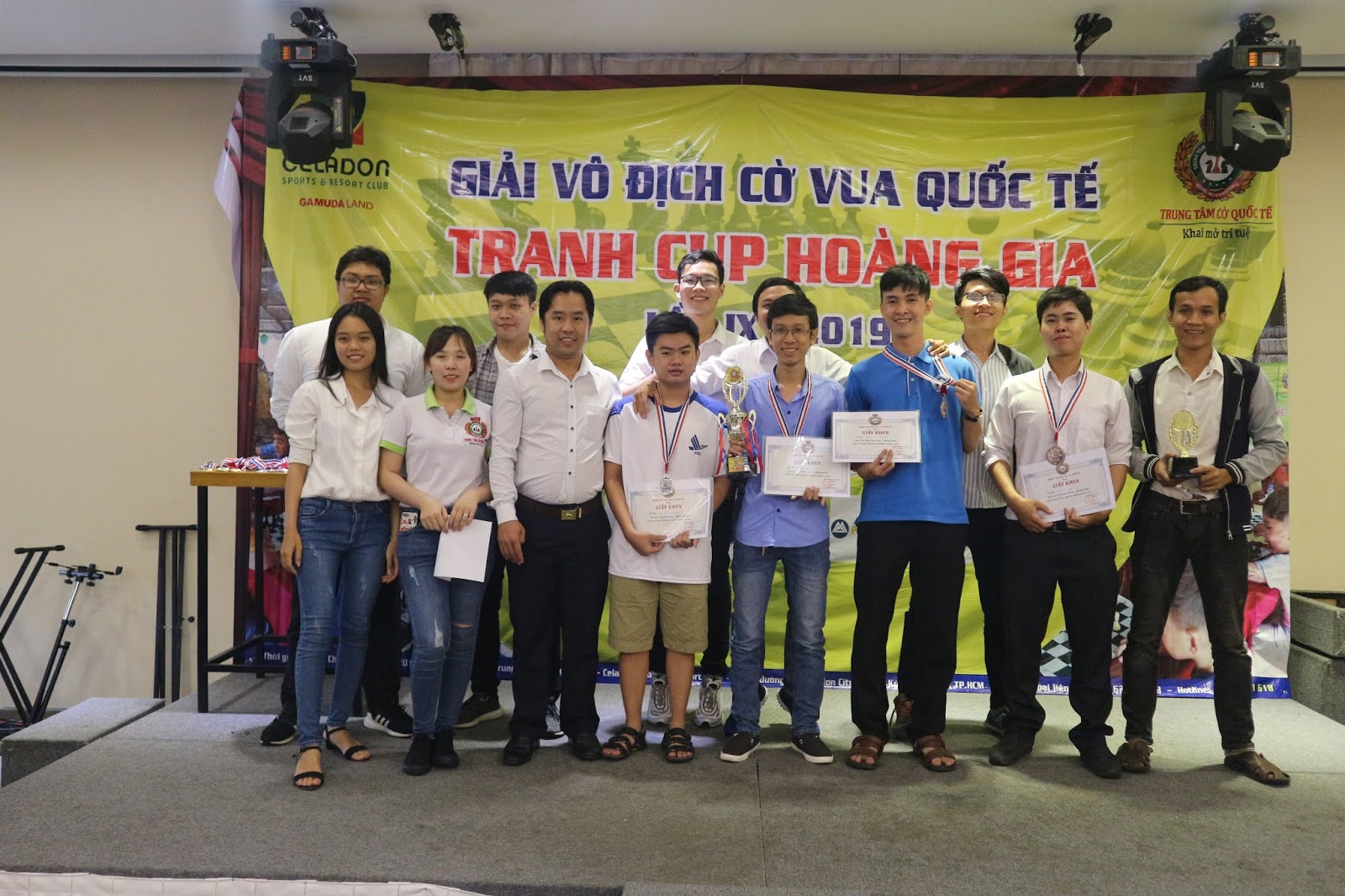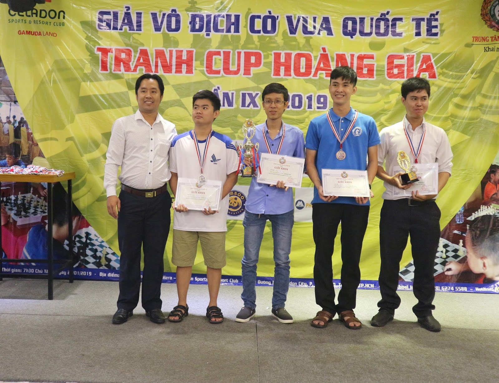 Giám Đốc Trung tâm cờ vua Quốc Tế, ông Huỳnh Tấn Bảo và các thí sinh đoạt giải nhóm Open của cuộc thi tranh cup Hoàng Gia với chủ đề: “khai mở trí tuệ, nhân tài đón xuân”