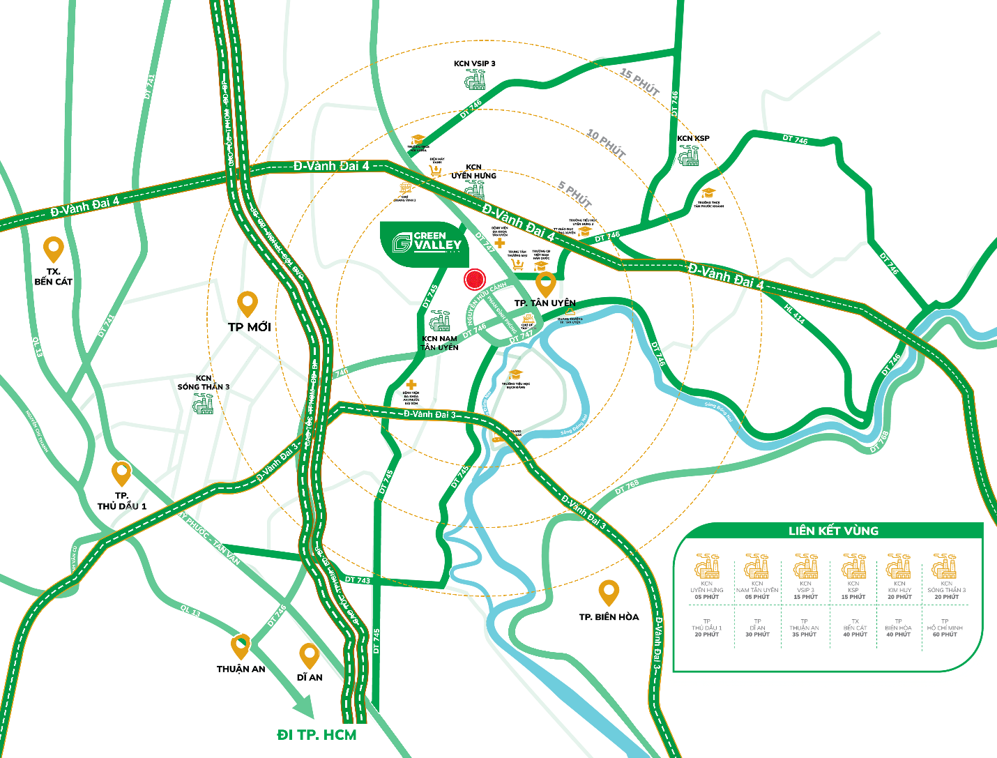 Green Valley City – “thành phố trong thung lũng xanh” tại Tân Uyên, hội tụ tiện ích chuẩn resort, vị trí chiến lược, an ninh khép kín và mảng xanh hiếm có. Đón đầu hạ tầng Vành đai 4 và làn sóng công nghiệp, đây là thời điểm vàng để vừa an cư, vừa đầu tư sinh lời bền vững.